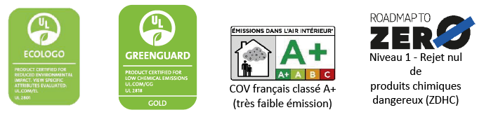 - de nouvelles encres Latex, sans solvant (pour protéger notre planète), sans COV (pour protéger l'opérateur), sans odeurs (pour le confort des salariés), avec une durabilité extérieure supérieure (pour protéger la planète... et le portefeuille de nos clients), certifiées UL GREENGUARD GOLD et ZDHC niveau 1, conformes aux directives européennes sur la sécurité des jouets EN 71-3 et EN 71-9