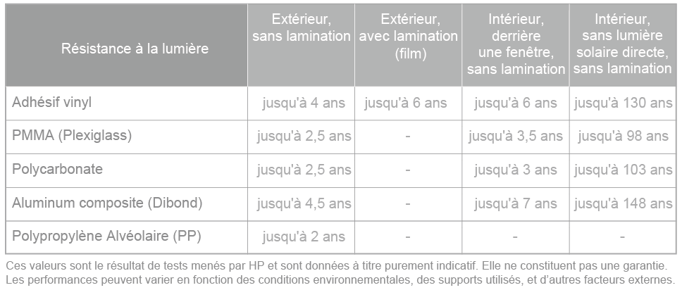 La formule des encres permet une excellente durabilité dans le temps, même sans ajout de lamination anti-UV.